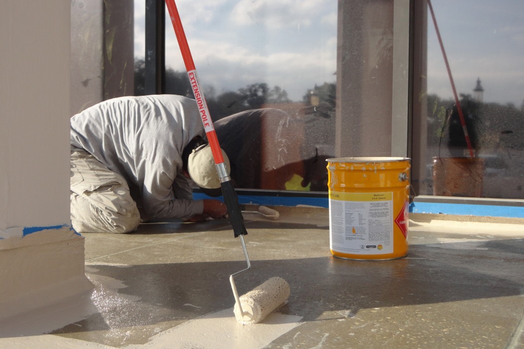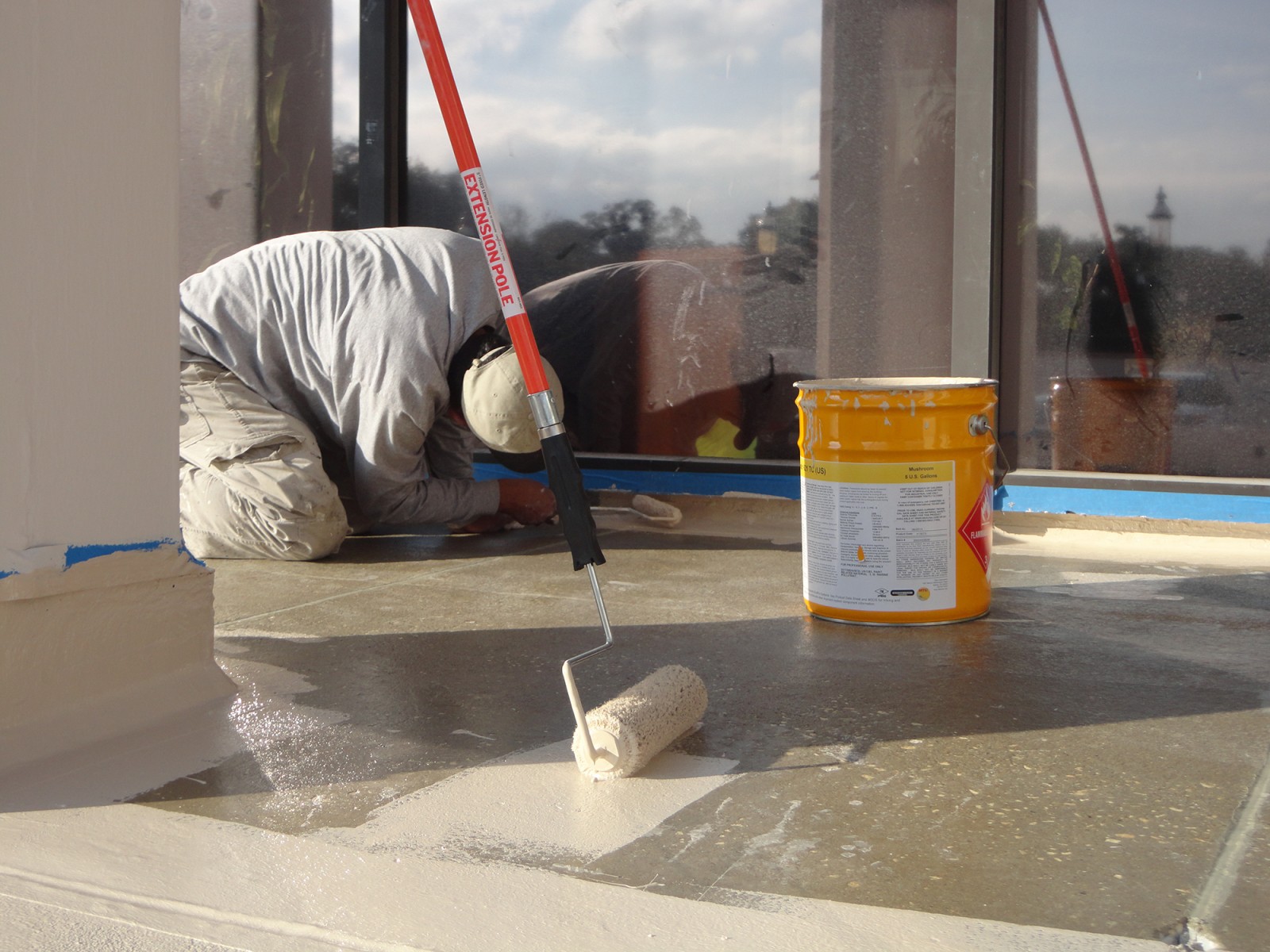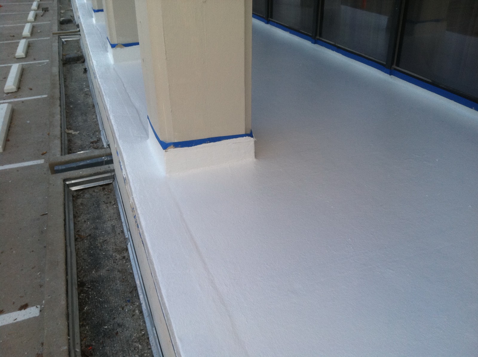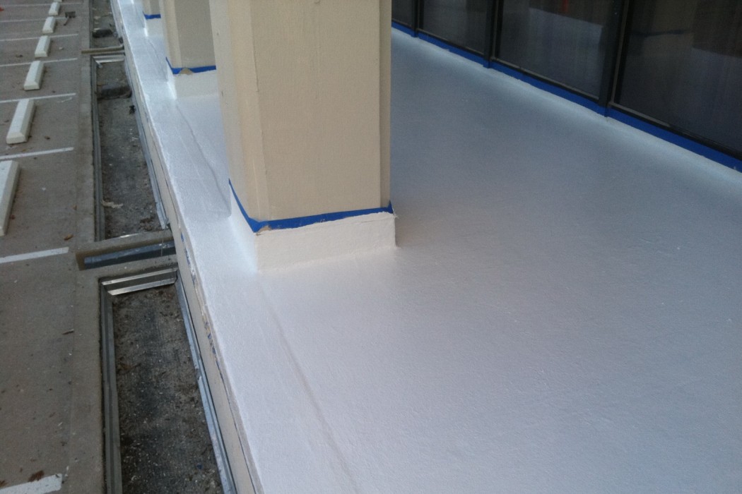 The 2001 Kirby Drive building is a thirteen-story building built in 1967. Its structural frame consists of cast-in-place concrete pan joists, beams, and columns. The first floor has a perimeter open breezeway with occupied space below. The waterproofing system for the first floor breezeway was constructed of a sandwich slab system consisting of a cast-in-place concrete slab (pan joist system for the building) covered by a waterproofing membrane and a cast-in-place concrete topping slab. Water leaks in the occupied spaces below the breezeway have been reported by the building manager over the years.