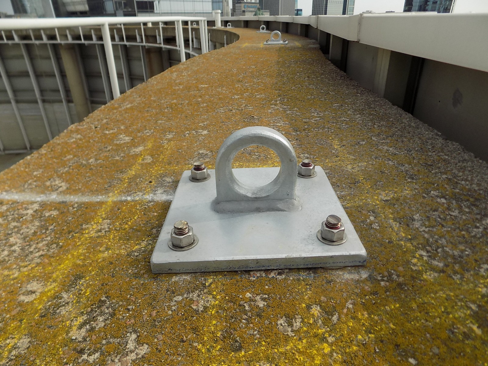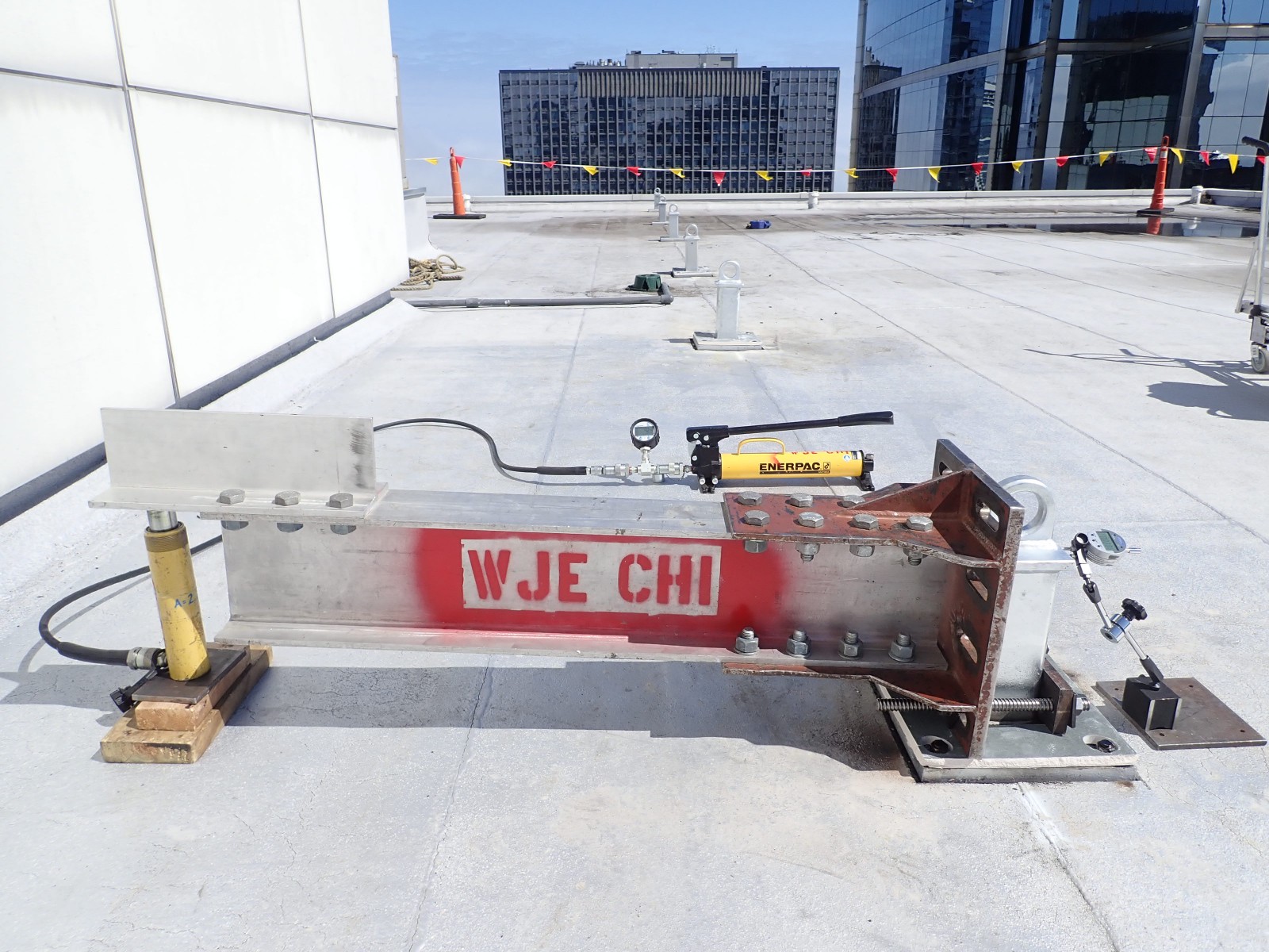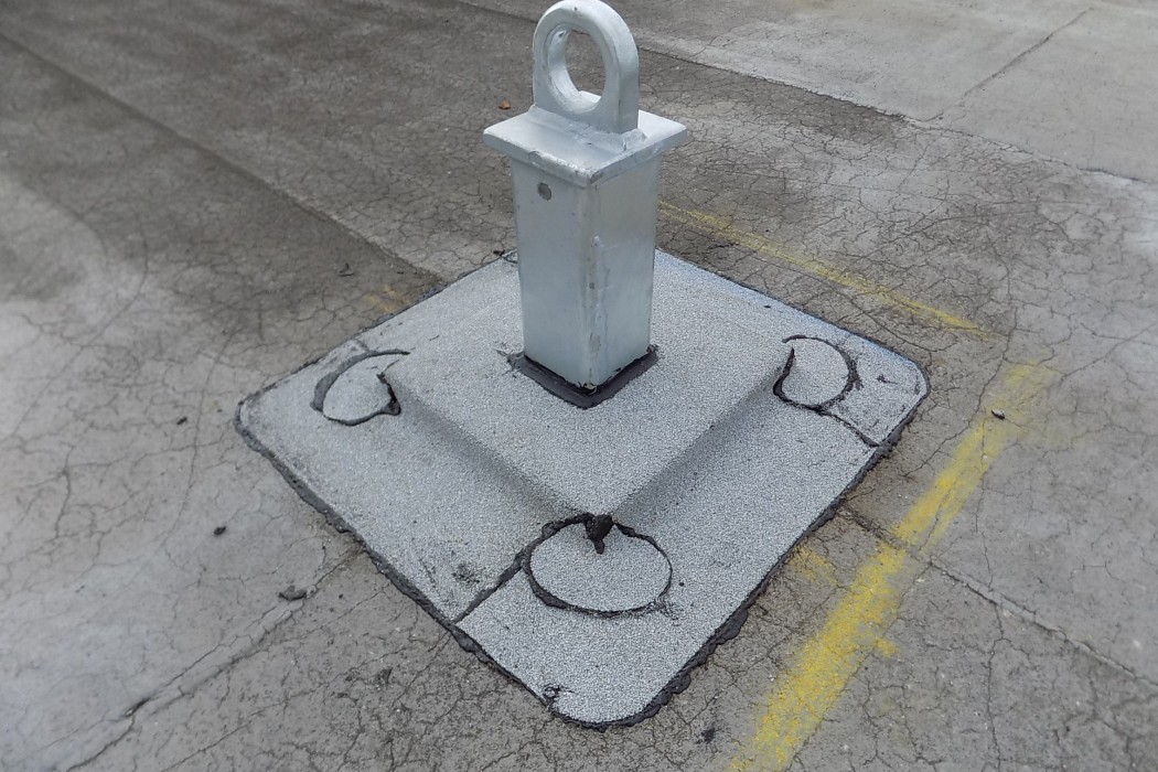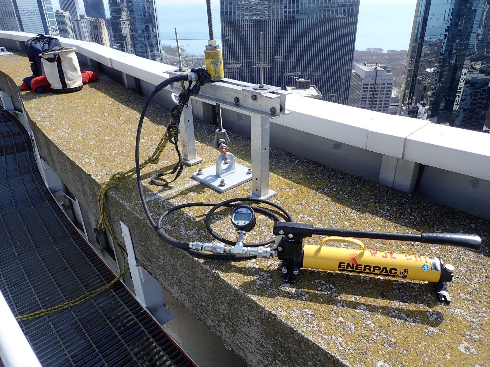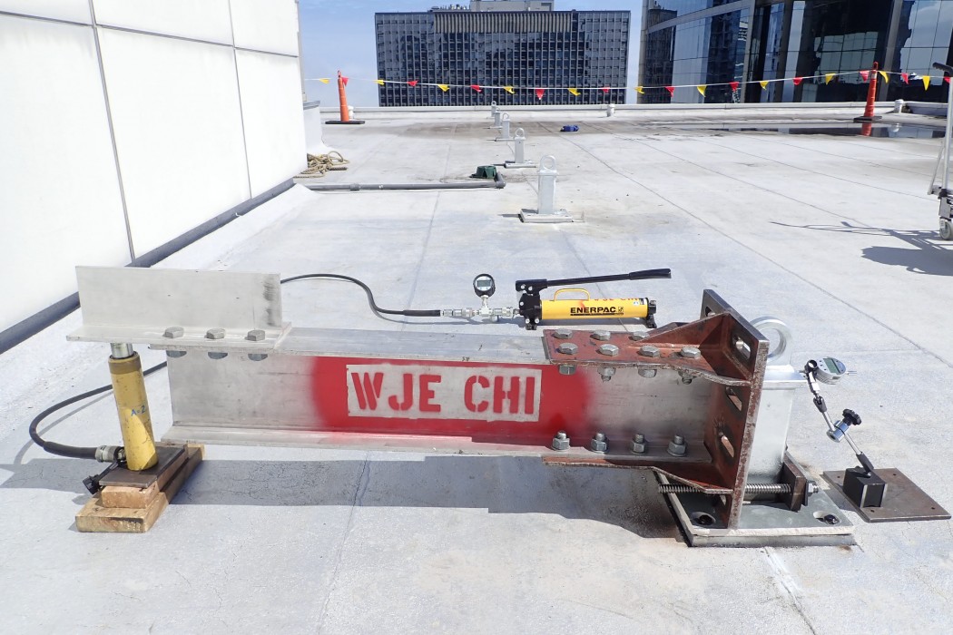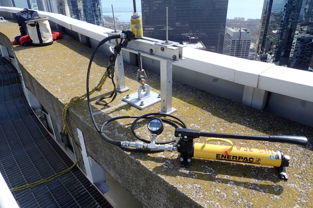 Each anchorage was loaded in a manner that replicated the minimum strength (i.e. 5,000 pounds) required by OSHA and the Chicago Building Code in potential directions of use. All anchorages supported the test load without any significant permanent deformation or failure. Based on our test results, WJE concluded that each certified anchorage is suitable for securing a single fall arrest lifeline or equipment tieback wire rope for facade access using IRA or contractor-provided suspension equipment.