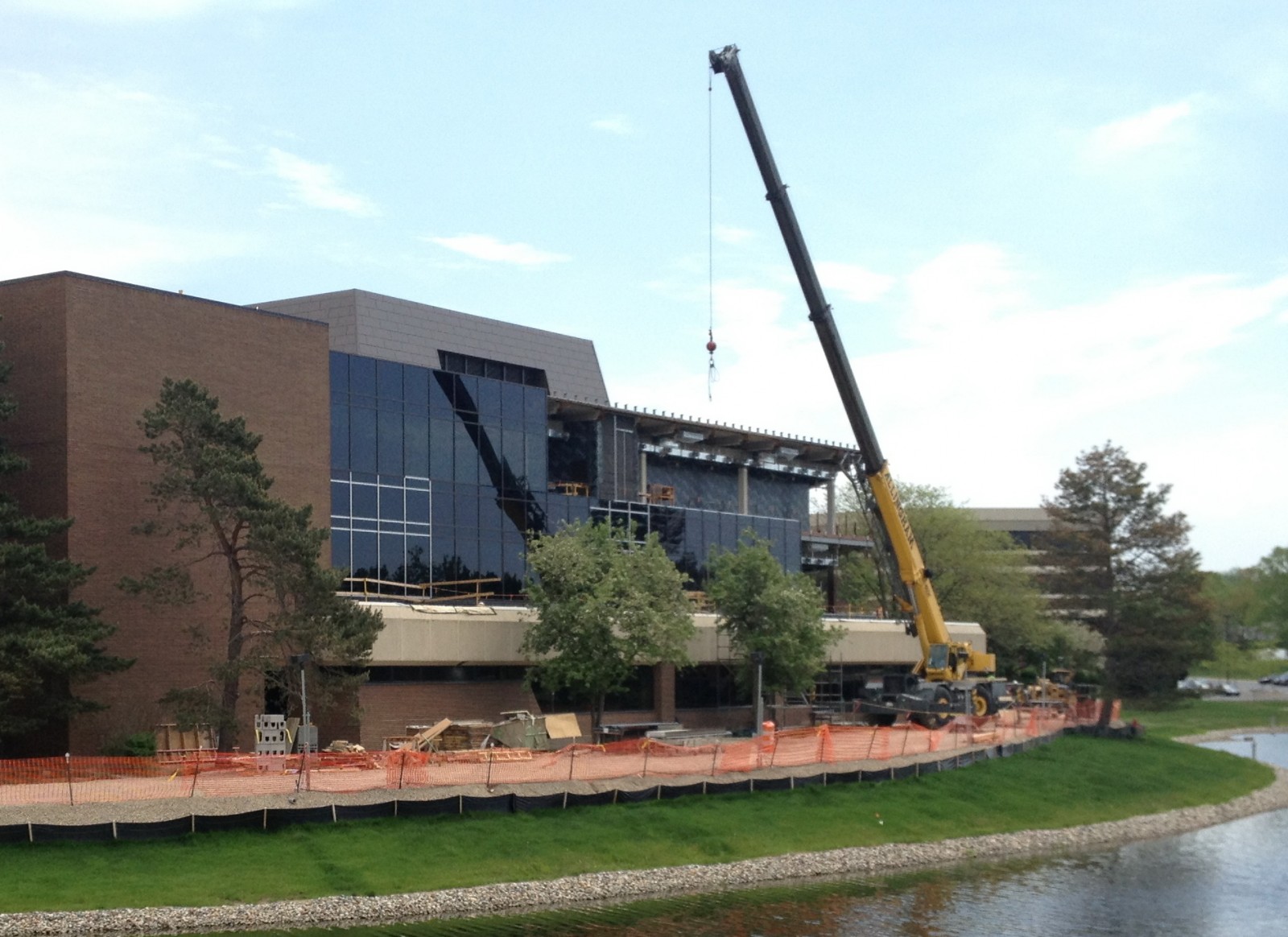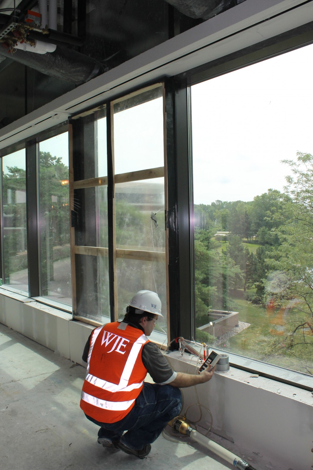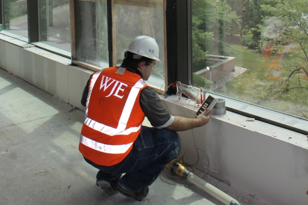 WJE provided peer review services prior to construction of the enclosure and performed reviews of contractor submittals. WJE's focus during these reviews was the integration of the various enclosure systems to achieve continuous thermal, air, and moisture barriers at the new exterior wall enclosures and the related tie-in detailing. Mayotte, Christman, and WJE worked collaboratively during the early phases of construction to refine details and to establish an agreed upon construction quality control program. Periodically throughout construction, WJE performed milestone site visits to observe and document the building enclosure work in progress and to conduct performance testing on the various assemblies.