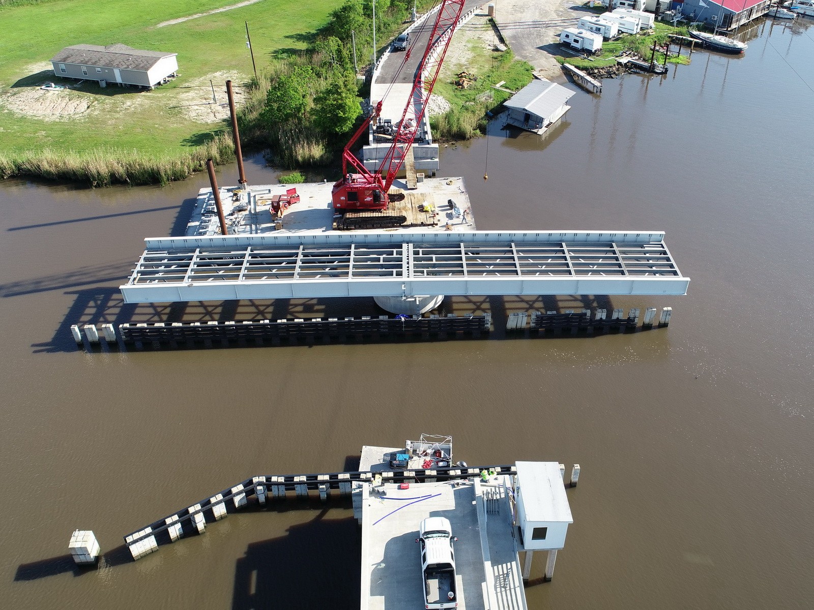 The East Roundbunch Road Swing Bridge over Cow Bayou was opened in 1963 and features nine spans along its length. The bridge is approximately 392 feet long with a roadway that is twenty-four feet wide, accommodating two traffic lanes. Seven of the spans are simply supported, reinforced concrete slab and girder (pan form) approach spans. The remaining portion of the historic bridge is a center bearing steel swing span that pivots about a center pier. The bridge is one of the last remaining operating swing bridges in Texas and is owned and operated by Orange County.