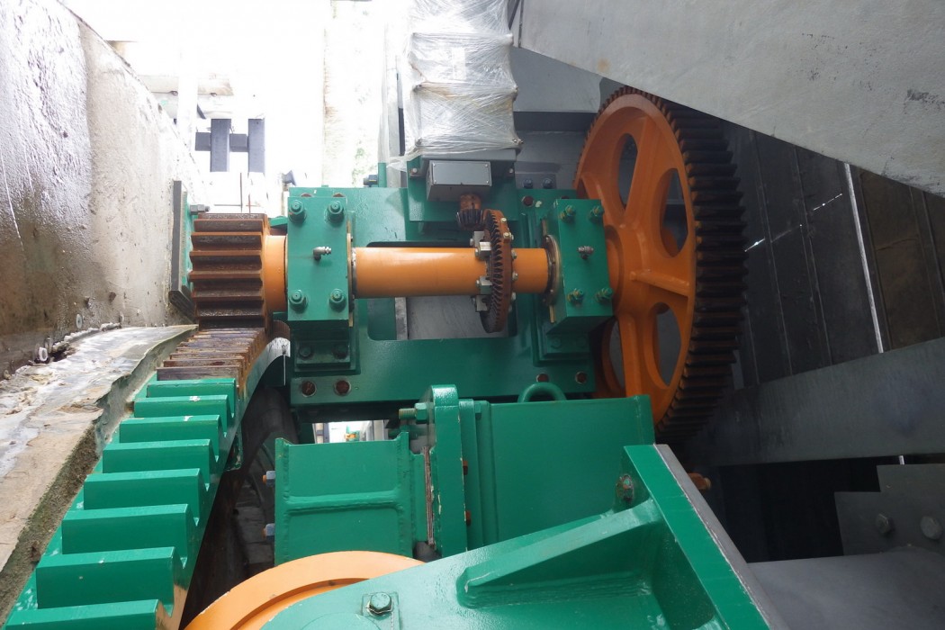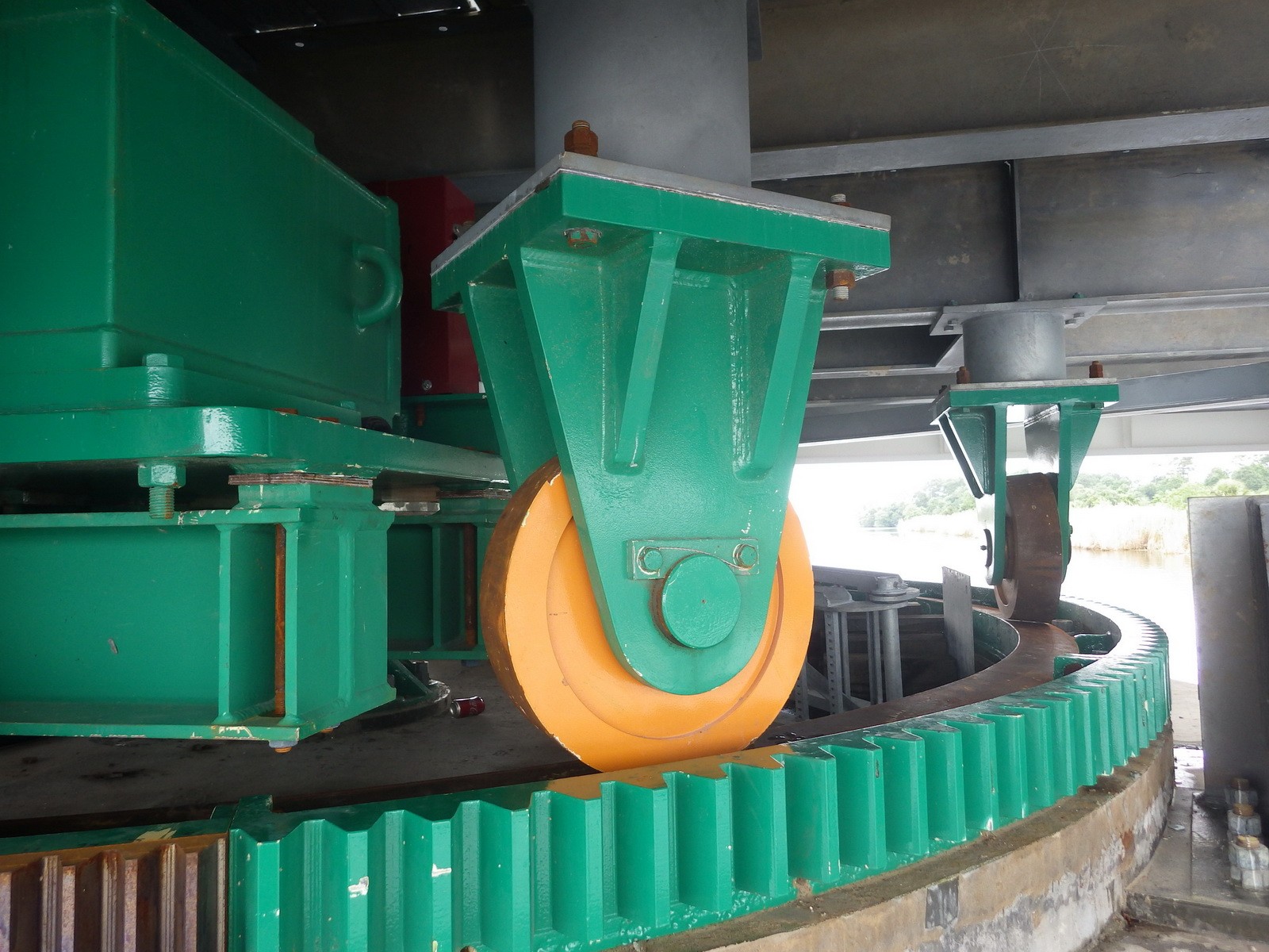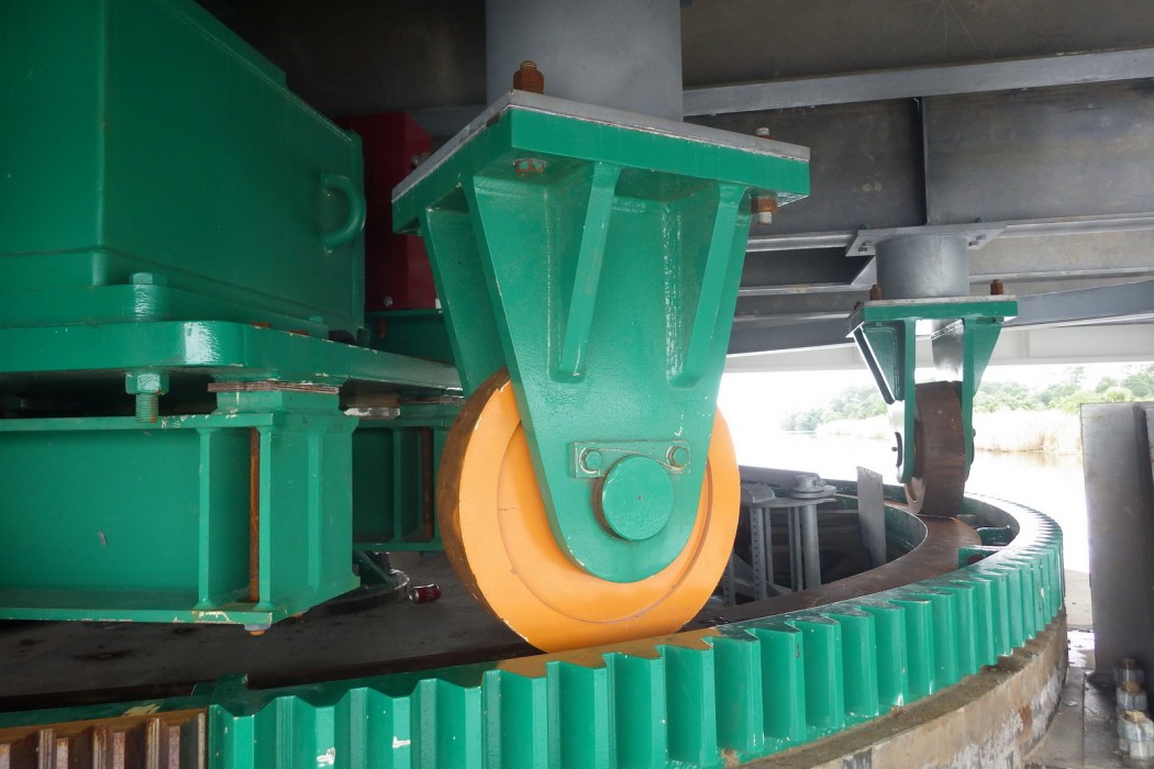 The mechanical design provided for new span drive machinery and support machinery in accordance with current AASHTO requirements and was comprised of components powered by an electric motor. The support machinery included a new bronze plain center bearing, balance wheels, and a wedge at each corner driven by an electromechanical drive train. The design also included center pier live load rollers instead of center wedges. Elastomeric bumpers were provided as a simple low-cost solution with minimal maintenance requirements.