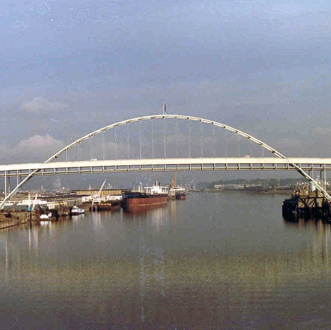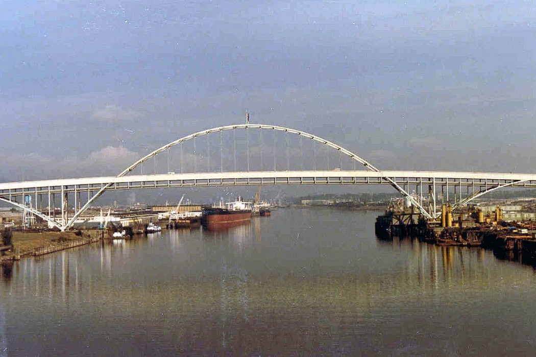 The Fremont Bridge is a three-span, stiffened steel arch bridge crossing the Willamette River, having a total length of 2,159 feet. The arch is designed to act in compression, and the tie girder acts in tension to counteract the thrust of the arch as well as in flexure to resist live-load bending moments. The main span consists of twenty-eight panels at 44 feet, 10 inches each for a total length of 1,255 feet 4 inches. The side spans consist of 10 panels at 44 feet, 10 inches each for a total of 448 feet, 4 inches.