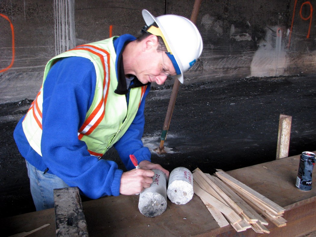 WJE engineers performed a variety of physical and nondestructive tests on the overpass concrete, including visual observation, acoustic impact testing, petrographic studies, compressive strength testing of concrete cores, and tensile strength testing of reinforcing steel. After testing and analyzing the samples, the team provided Caltrans conclusions regarding the condition of the concrete and recommendations for the repair or replacement of the concrete where necessary.