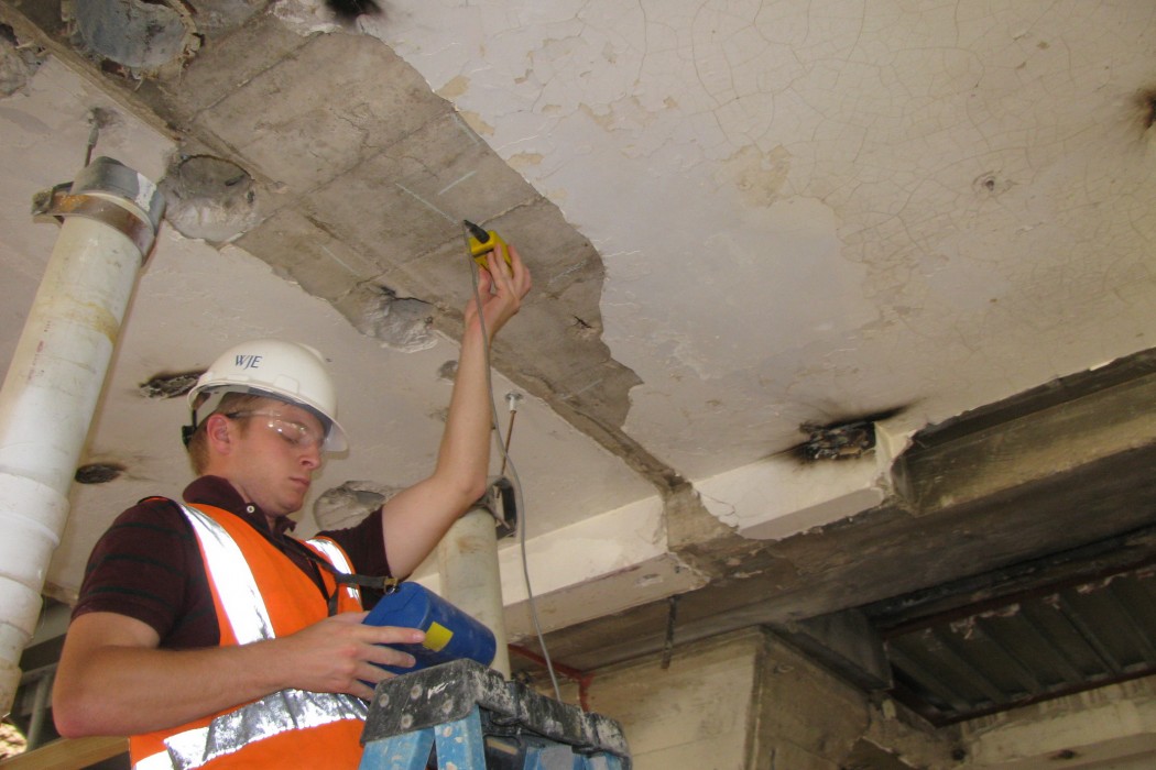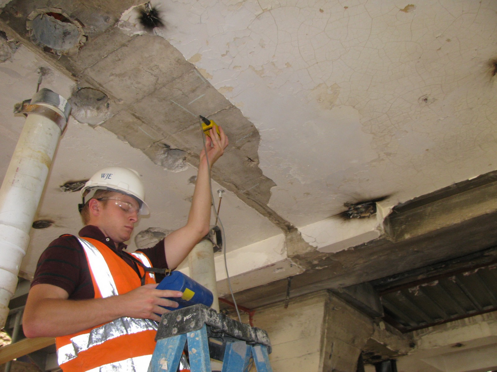 During its assessment of the 1604 Main Street building, WJE determined that many reinforcing bars had minimal concrete cover or were partially exposed. The concrete bond at these bars and therefore the slab strength was uncertain. As a result, a load test was performed at a portion of one level to aid in assessing the load carrying capacity of the existing slab.