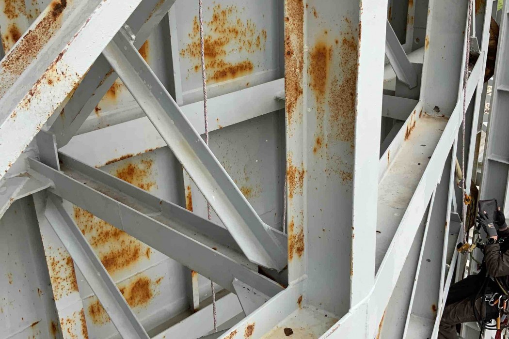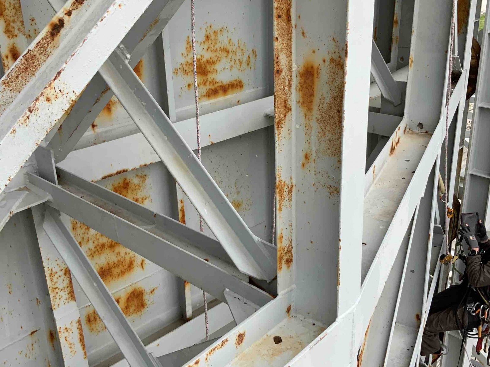 The towers and bridge exhibited limited and localized distress, primarily consisting of corrosion at edges and crevices, connection distress, pitting or freckled rust, and coating delamination. The liftgate had similar distress, though it was more widespread. The observed distress was most severe on the portion of the liftgate that is submerged and located within the splash zone when Tide Gate is lowered. The existing coating was generally intact, but the observed deterioration and areas with lower adhesion values suggest it is nearing the end of its practical life. Elevated levels of distress to the coating system were visually apparent at the bottom twenty feet of the space frame. We recommended repair and coating options to extend the service life of Tide Gate, which included recoating the steel (in the atmospheric and submerged/splash zones), localized replacement, partial replacement, and full replacement of the gate.