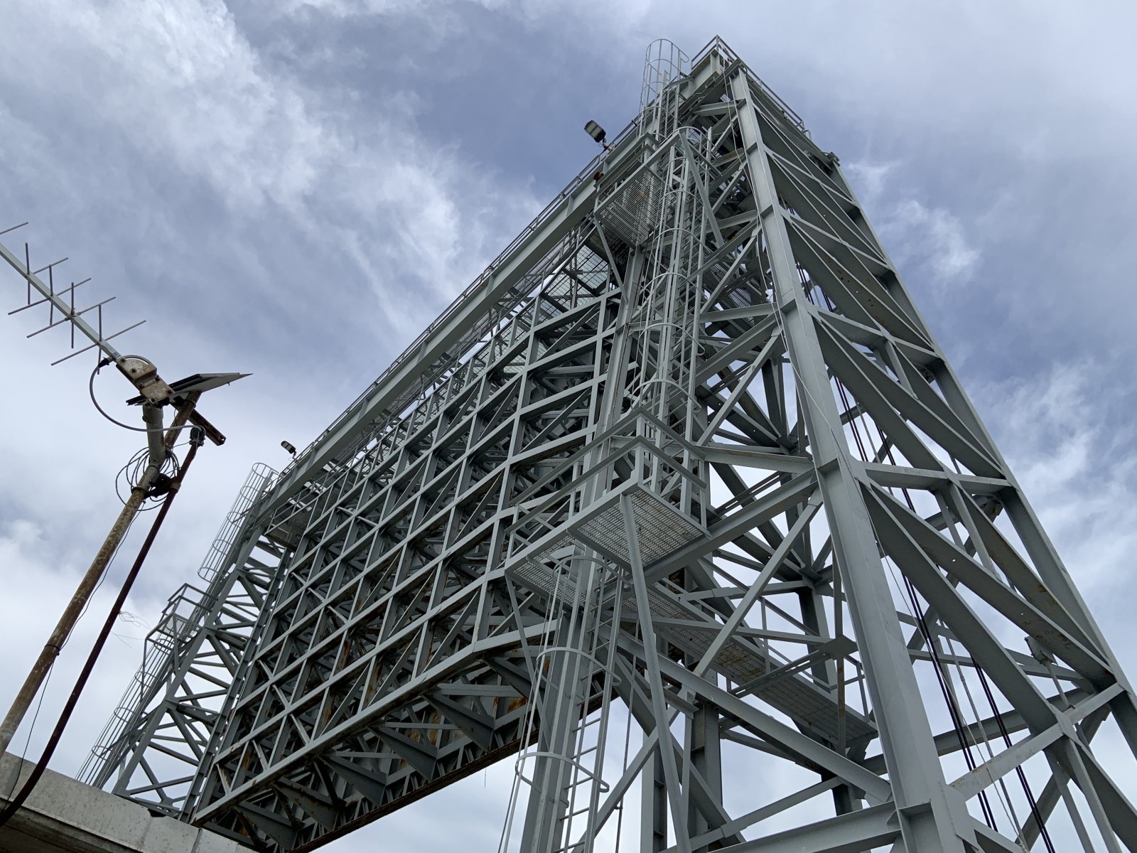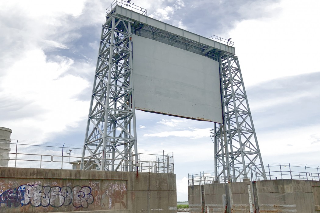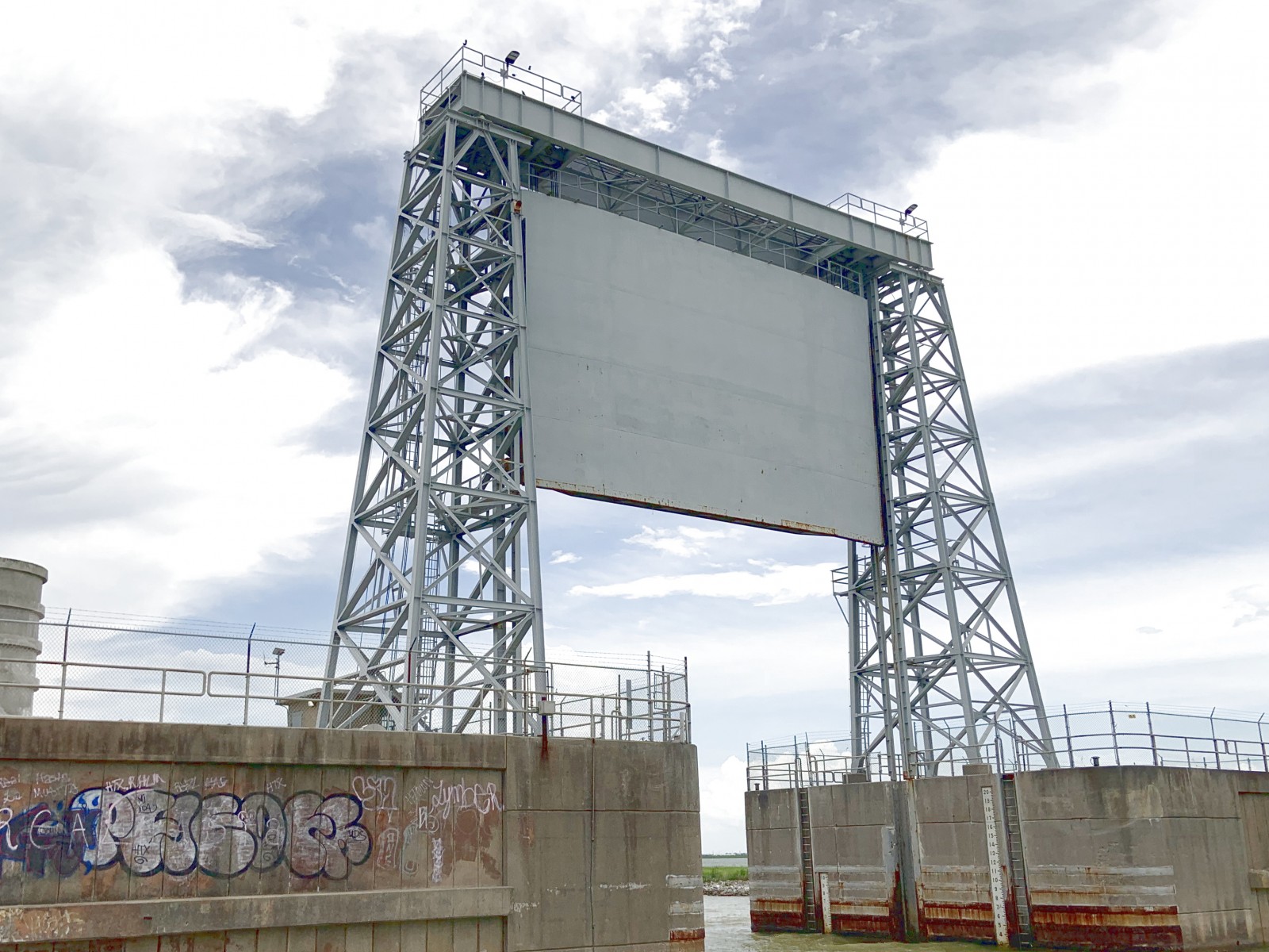 The lower ten feet of the gate were replaced in 2005, and a new coating system for structural steel components was installed. Repairs in 2016 and 2019 replaced bearings, races, and seals at the cable pulleys at the top of the gate and addressed damaged sheaves. Galveston County was awarded funding from the U.S. Army Corps of Engineers (USACE) to help ensure the continued functionality of the Texas City Hurricane Levee. The County used part of this funding to address the Tide Gate’s failing coating and corrosion at the lower portion of the gate.