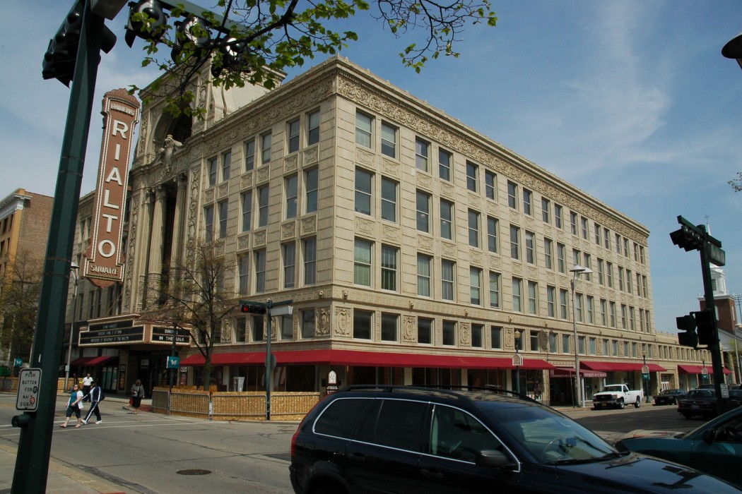 The Rialto Square Theatre opened in 1926 and was originally designed and operated as a vaudeville movie palace. This four-story Neo-Baroque-style building is clad with terra cotta on the south and west facades. The north and east facades of the building are clad with common brick masonry. The structure of the building is reinforced concrete with mass brick masonry infill. The four-story portion of the building has plan dimensions of 174 feet in the east-west direction and 132 feet in the north-south direction.