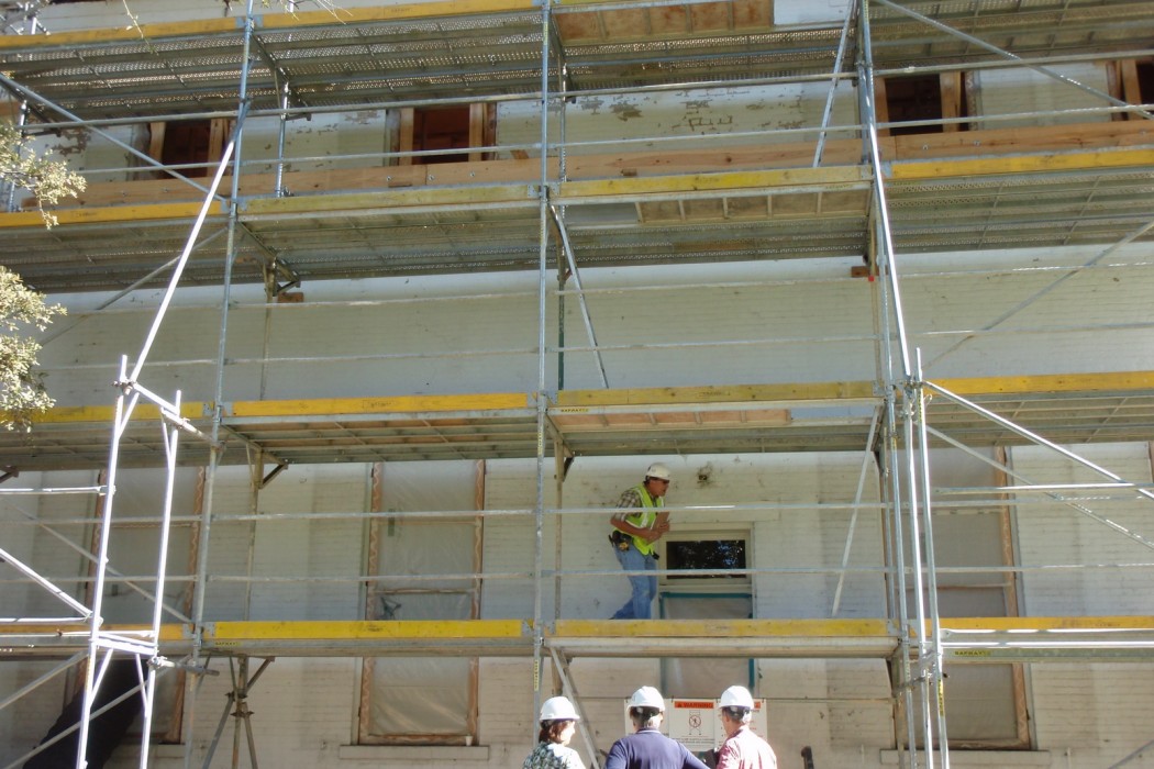 WJE performed a limited visual survey of the load bearing masonry walls at the original portion of the mansion to document preexisting distress as well as fire-related distress. WJE used nondestructive reinforcement location equipment to assess whether dowels were present connecting the bond beam to the masonry below. No evidence of dowels extending into the masonry was detected. WJE coordinated with the project team to select sample locations of plaster, mortar, and masonry for material testing and analysis. Representative bricks were selected for petrographic examination and compression testing.